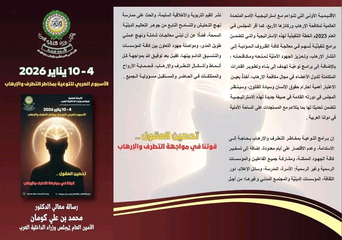 تحتفي الأمانة العامة لمجلس وزراء الداخلية العرب كل عام بالأسبوع العربي للتوعية بمخاطر التطرف والإرهاب الذي يوافق الأسبوع الأول من شهـر يناير (كانون الثاني)، ويمثل هذا الأسبوع مناسبة للتنبيه إلى مخاطر التطرف والإرهاب اللذان أصبحا يشكلان أحد أبرز التحديات التي تواجه استقرار الدول والشعوب، ويهددان السلم والأمن الدوليين، وفرصة هامة للتأكيد على أهمية الاستمرار في تكثيف البرامج التوعوية وتنويعها.