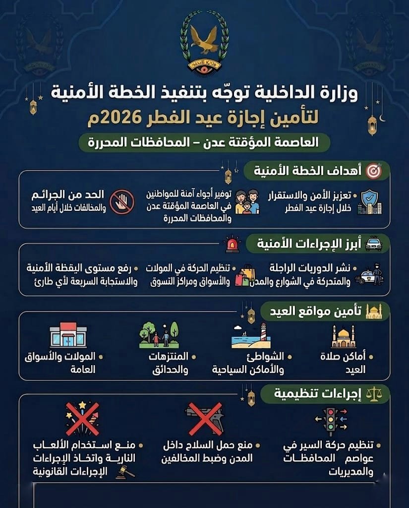 وأكد قطاع الأمن والشرطة في تعميم موجّه لمدراء الأمن بالمحافظات أن الخطة الأمنية ستبدأ من أول أيام عيد الفطر المبارك، وتهدف إلى تكثيف الجهود الأمنية وتعزيز الاستقرار في العاصمة المؤقتة عدن وبقية المحافظات المحررة، بما يضمن توفير أجواء آمنة للمواطنين خلال أيام العيد.