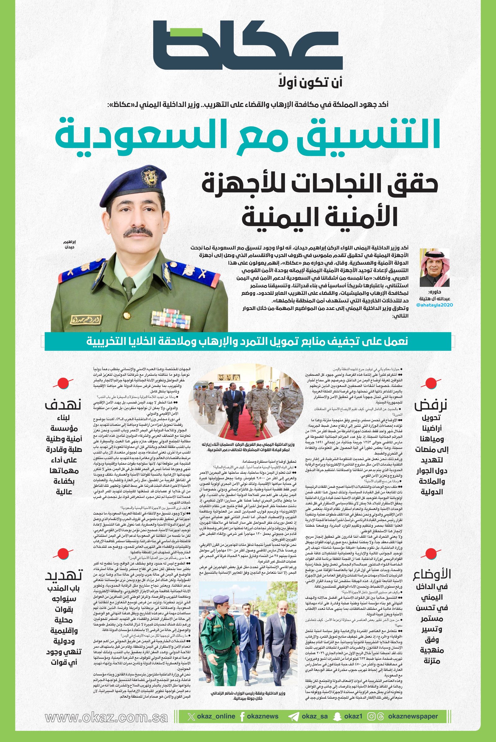 أكد وزير الداخلية اليمنى اللواء الركن إبراهيم حيدان، أنه لولا وجود تنسيق مع السعودية لما نجحت الأجهزة اليمنية في تحقيق تقدم ملموس في ظروف الحرب والانقسام الذي وصل إلى أجهزة الدولة الأمنية والعسكرية. وقال، في حواره مع «عكاظ»، إنهم يعولون على هذا التنسيق لإعادة توحيد الأجهزة الأمنية اليمنية لإيمانه بوحدة الأمن القومي العربي. وأضاف: «ما نلمسه من أشقائنا في السعودية لدعم الأمن في اليمن استثنائي، باعتبارها شريكاً أساسياً في بناء قدراتنا، وتنسيقنا مستمر لمكافحة الإرهاب والمليشيات، والقضاء على التهريب العابر للحدود، ووضع حد للتدخلات الخارجية التي تستهدف أمن المنطقة بأكملها».